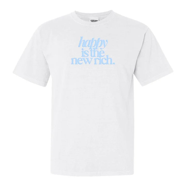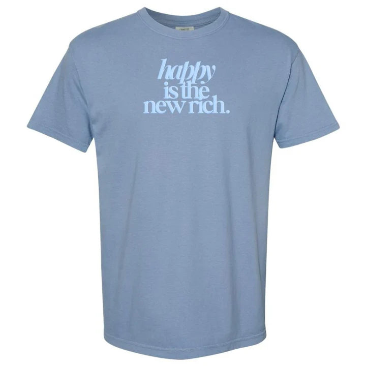 Find joy in the everyday with our Happy Is The New Rich T-Shirt. Designed to keep you comfortable from morning errands to late-night hangs, this tee blends a relaxed cut with quality fabric—so you can spread good vibes wherever you go. Its statement print gives off a fun, uplifting energy, instantly brightening any look.