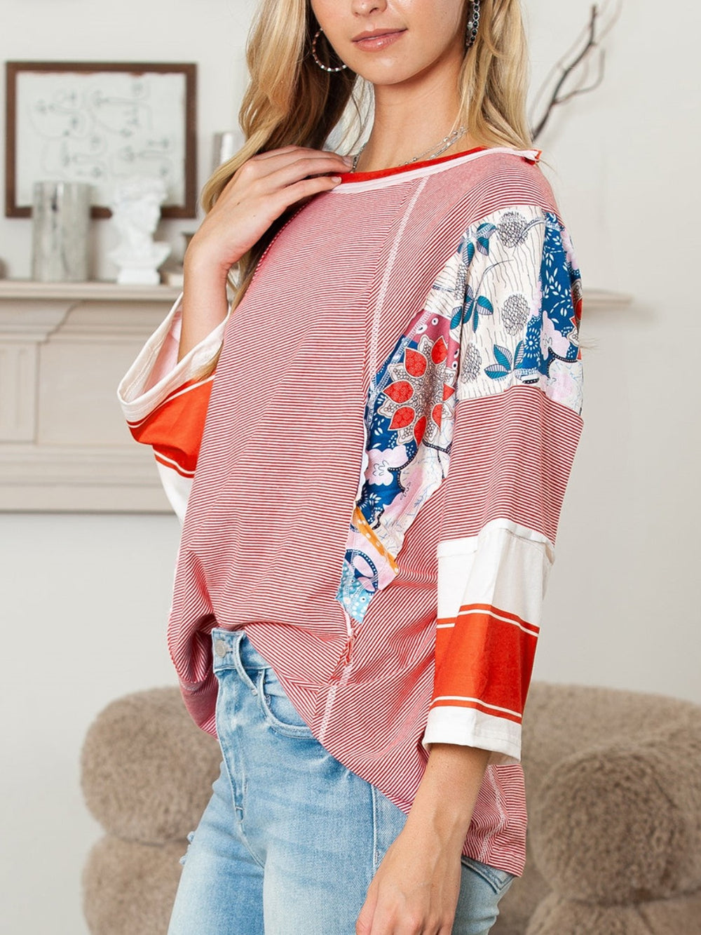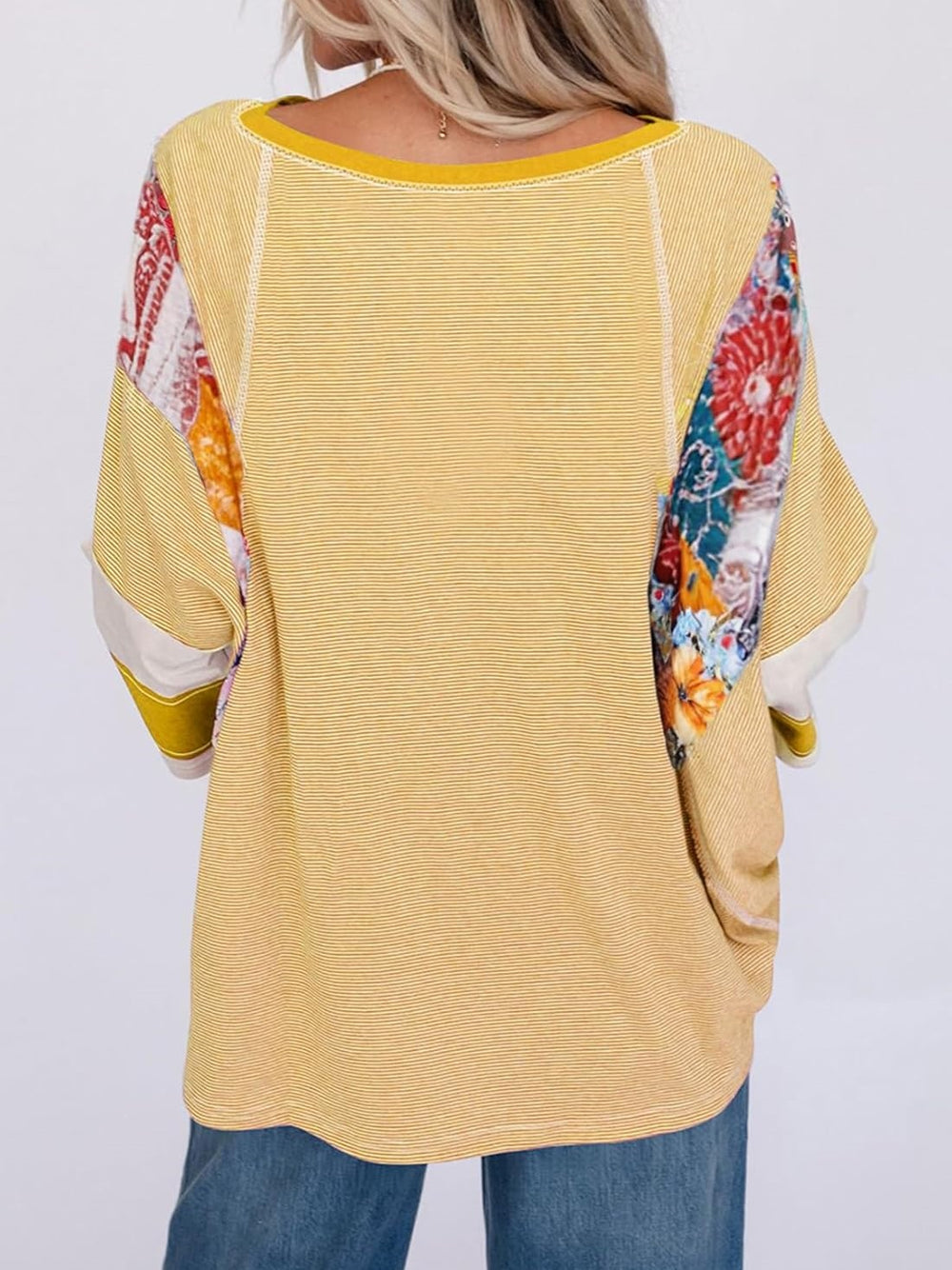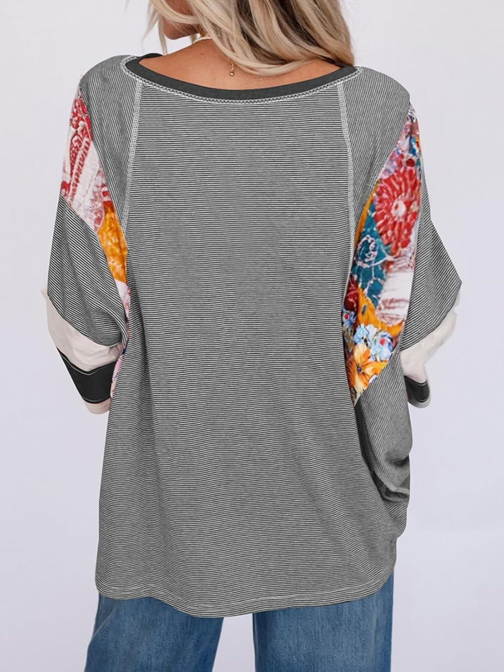 How cute! This chic top is the perfect versatile piece. Patchwork detailing on the sleeves add a feminine and delicate feeling. The vibrant, cheerful colors and design will instantly bring your mood up! An easy day to night essential for any bohemian fashion lover.