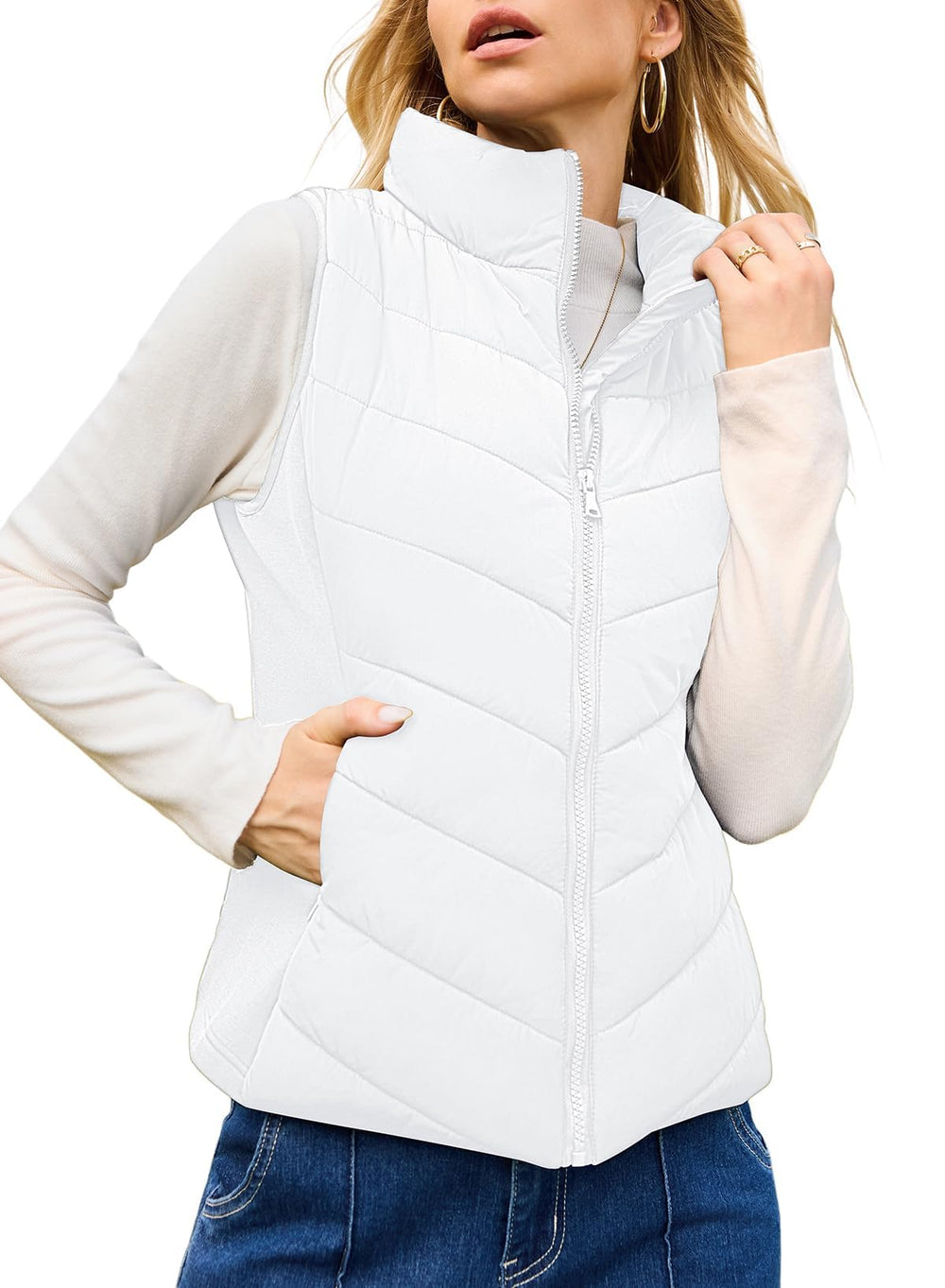 This Sleeveless quilted vest provides both warmth and a sleek, stylish look. Two side pockets for storing small essentials, the collar and front full zipper can resist the cold wind, ensuring durability and a secure fit, making it a versatile addition to any woman's wardrobe.
