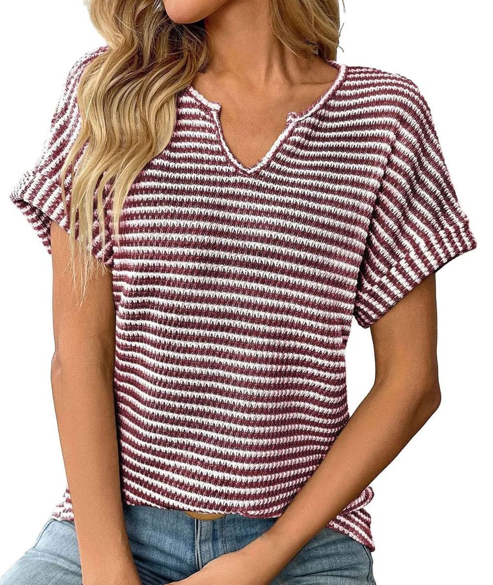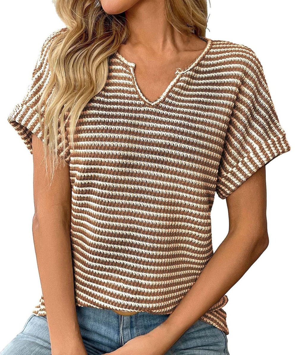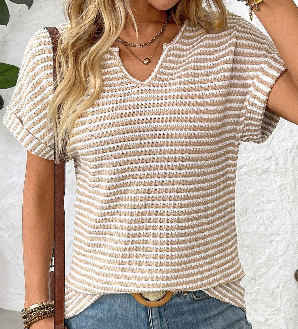Elevate your summer style with this ribbed V neck knit top. Featuring rolled hems and a flattering fit, this lightweight piece pairs effortlessly with any wardrobe, offering both comfort and elegance for warm-season occasions.