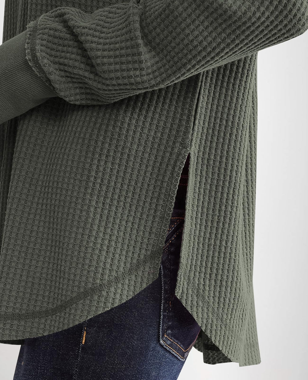 This is a great shirt for a chilly evening. The waffle knit fabric feels so soft and warm. The exposed seam is a chic design to balance the simple plain long-sleeved t-shirt. The loose-fit long-sleeved t-shirt women with a split hem is perfect as a maternity shirt and the stitching details make this casual v-neck shirt women unique and stylish.