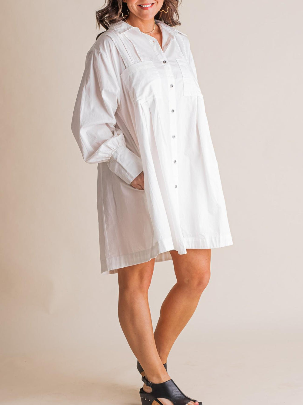 A pleated shirt dress for any occasion! With a collar, button-front closure, front pockets and a loose fit, this dress is both stylish and practical. Wear it alone for a chic look or layer it up for a more cozy ensemble.