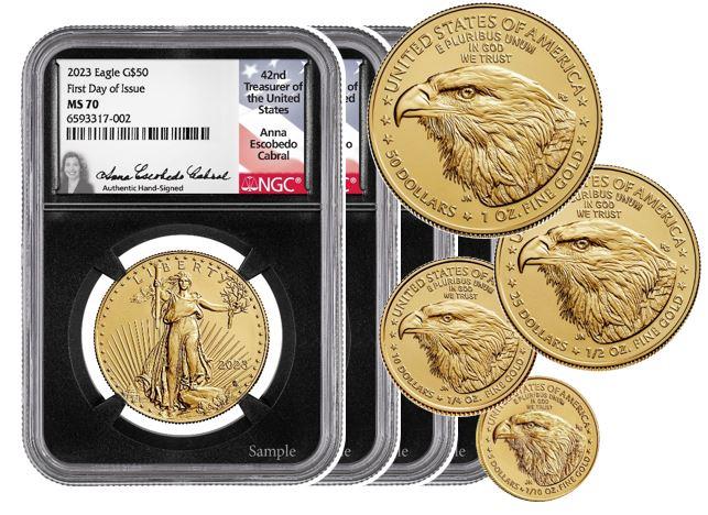 Each 2023 Gold Eagle coin available in this offer has been graded by the Numismatic Guaranty Company (NGC) as being in flawless Uncirculated Mint State-70 (MS70) condition, a distinction that means these perfectly-graded coins have ZERO imperfections—showing all features and fields exactly as the engraver and mint intended. In addition, NGC has certified that these Gold Eagles are First Day of Issue (FDI) coins, a designation that means they were received by NGC or an NGC-approved depository by the release date or on the business day within 24 hours of the official release date. Collectors seek out these coins because they are produced with new dies and considered to have sharper strikes and deeper mirrors than those that are struck later. Also, the population of coins labeled First Day of Issue is only a fraction of the total mintage. As a final touch, each coin available here has been sonically sealed in an acrylic holder with a unique black display core and encapsulated with a label personally signed by the 42nd US Treasurer, Ms. Anna Cabral! Only a handful of these signed, high-grade sets are available, making this offer highly coveted by Gold Eagle collectors.