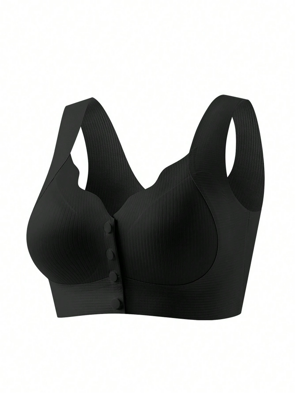 Introducing our "Front Closure Seamless Push Up Back Smoothing & Anti-Sagging Wireless Bra." This solid color bra offers ultimate breathability and comfort with its seamless design. The wide shoulder straps provide extra support and stability, while the front closure makes it easy to wear. The back smoothing feature and anti-sagging design ensure a flattering silhouette, and the backless style adds a touch of elegance. Perfect for everyday wear, this bra combines functionality with style.