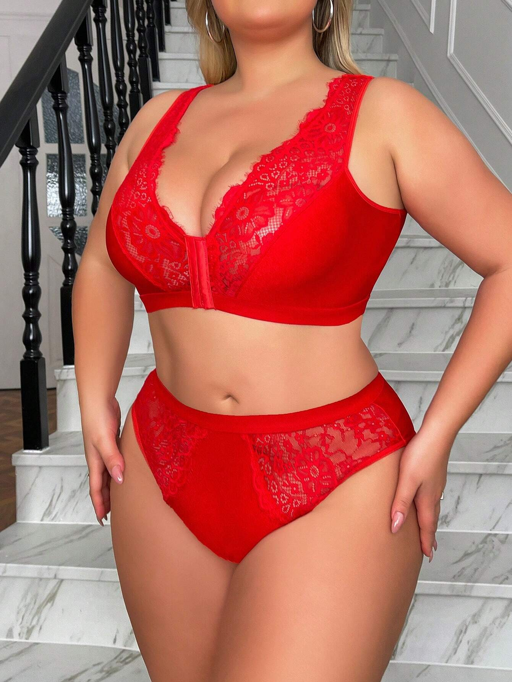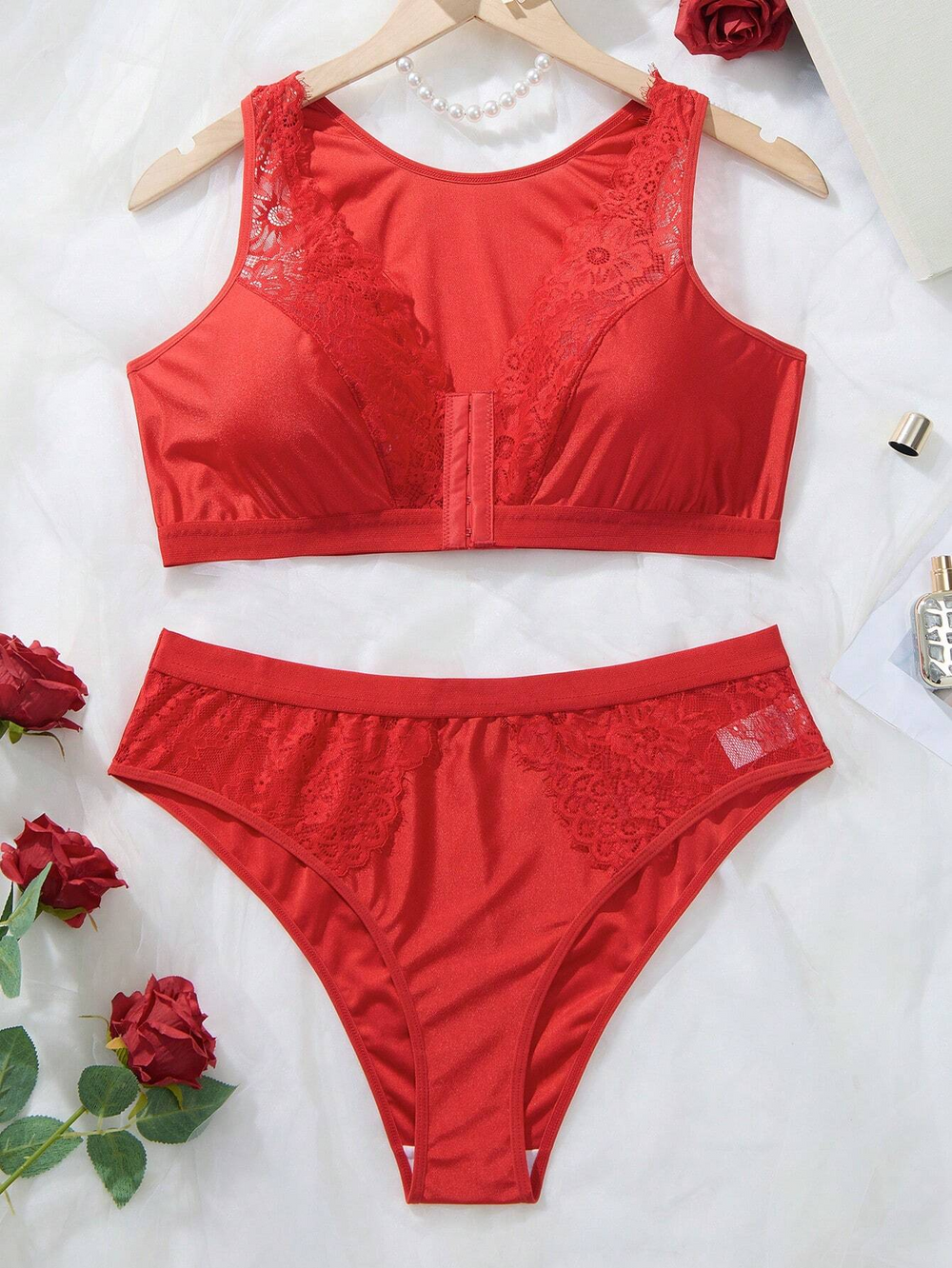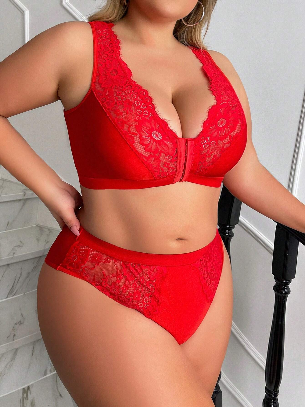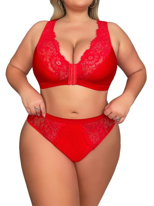 Introducing our "Front Closure Wireless & Comfortable Bra Set, Plus Size," designed for the ultimate blend of style and comfort. This solid color bra set features breathable, soft fabric for all-day comfort. The lace patchwork design adds a touch of elegance, while the front closure provides easy wear. The backless design ensures a seamless fit under any outfit, making this bra set a perfect addition to your everyday wardrobe.