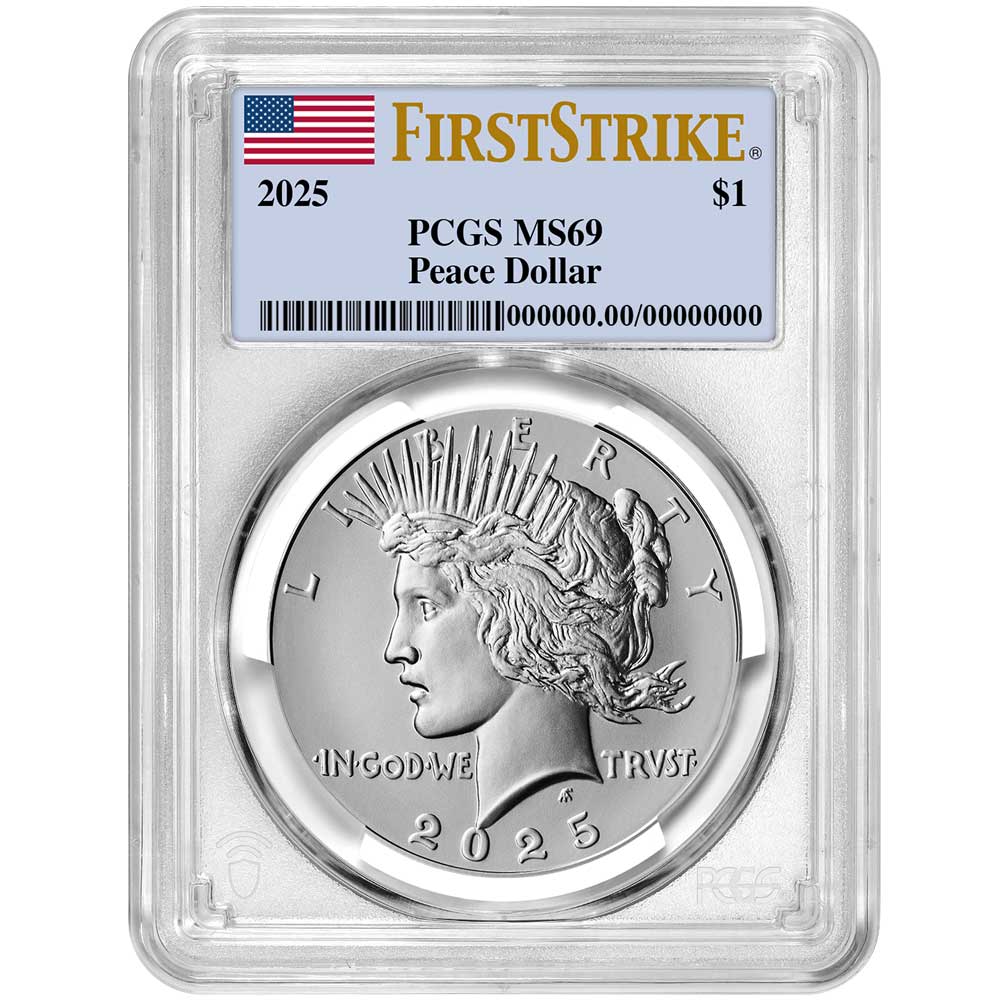 The obverse features Liberty in profile, a radiant crown on her head. Obverse inscriptions are “LIBERTY,” “IN GOD WE TRUST,” and the year of issuance. The reverse depicts an eagle at rest holding an olive branch above the inscription “PEACE.” Additional inscriptions are “UNITED STATES OF AMERICA,” “E PLURIBUS UNUM,” and “ONE DOLLAR.”