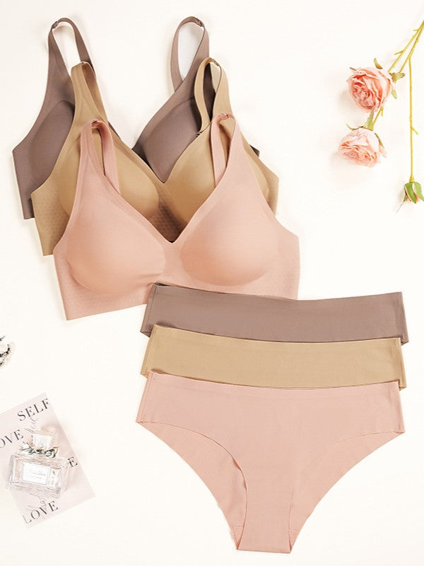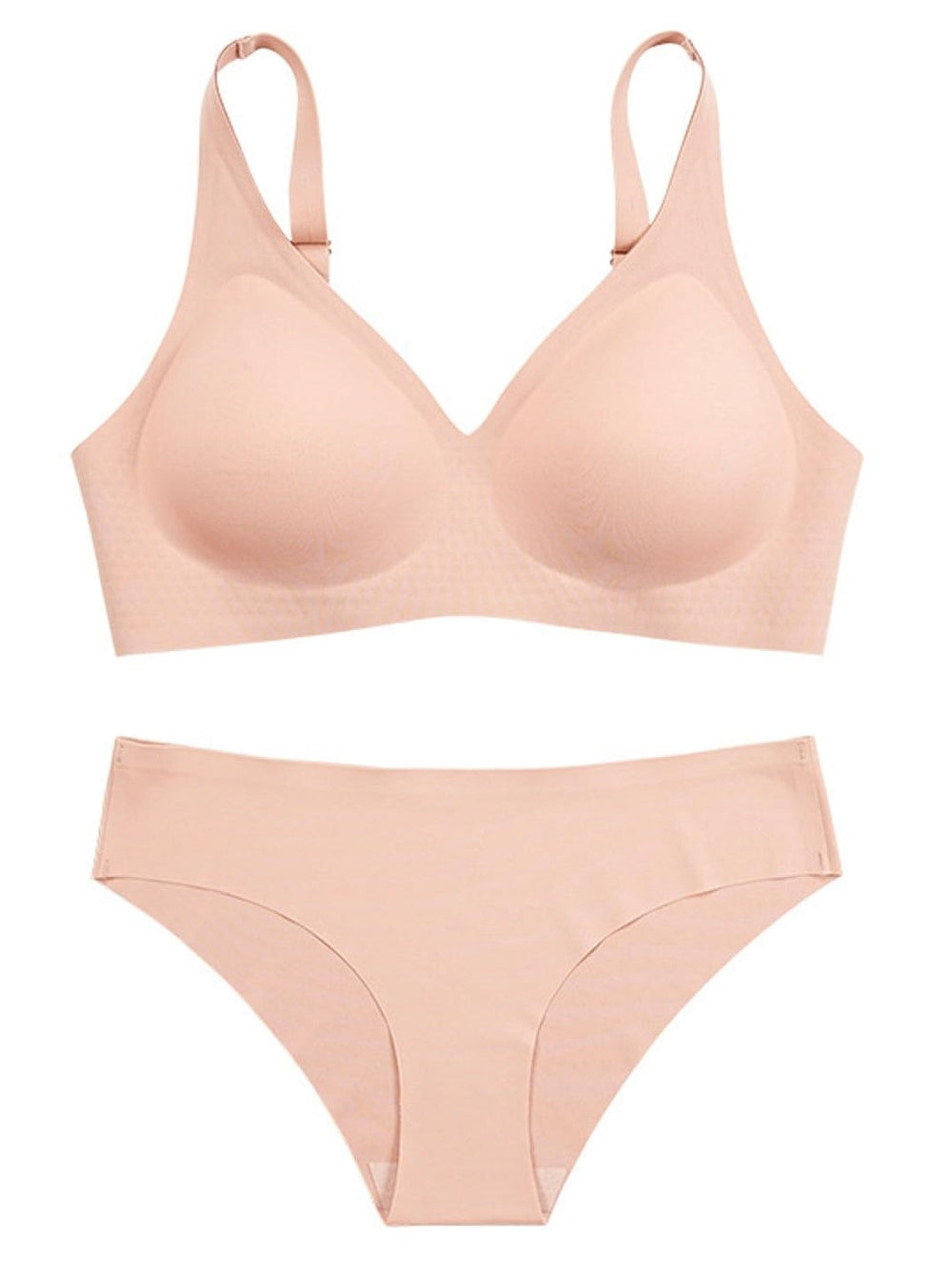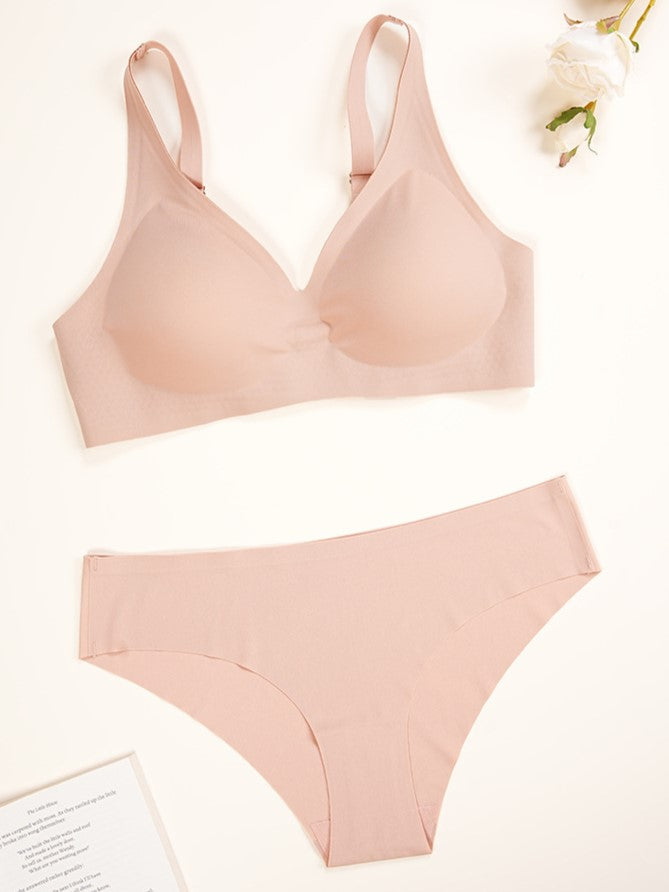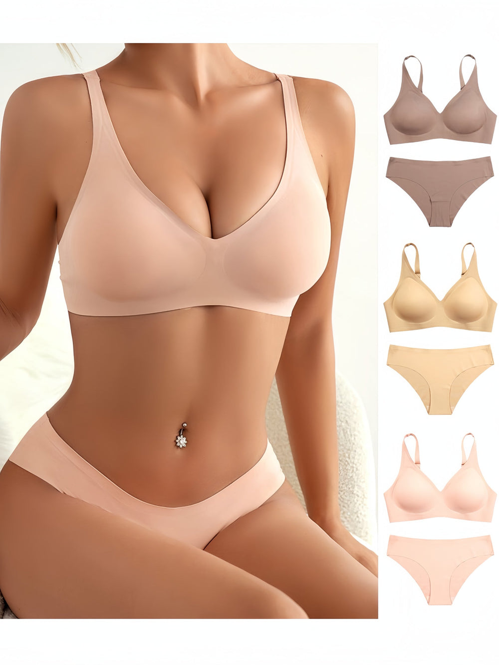 Introducing the Seamless Deep V Sexy Ice Silk Wireless Bra Set, crafted for ultimate comfort and a solid color sleek look. Made from breathable ice silk fabric, this set is designed for a seamless finish under any outfit. The wireless bra features thin adjustable straps and a deep V-neck for a flattering and sexy fit. Paired with seamless panties for a smooth, invisible feel, this set ensures all-day comfort and confidence, perfect for any occasion.