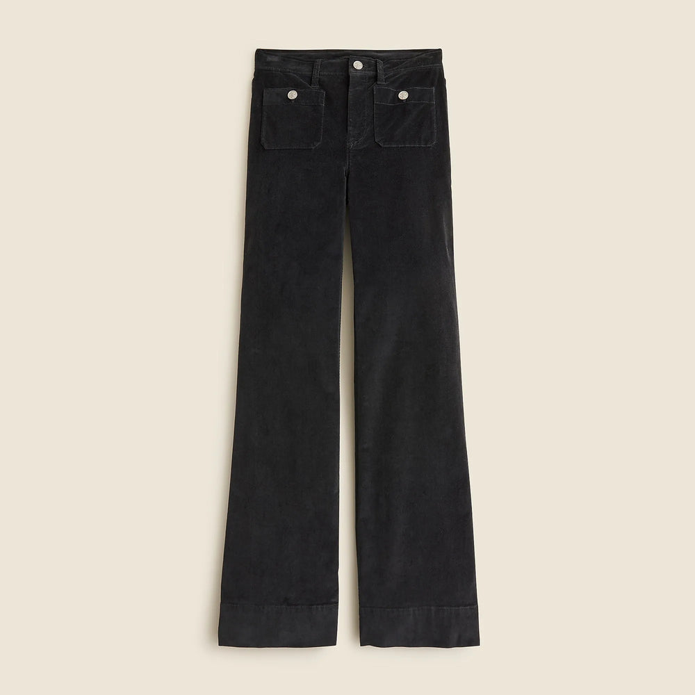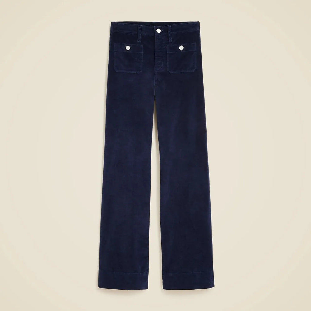 Our best-selling denim trousers, are refreshed with nautical details! This pair comes with a high rise and a full-length leg, plus patch pockets and our signature gold crest button details for added drama.