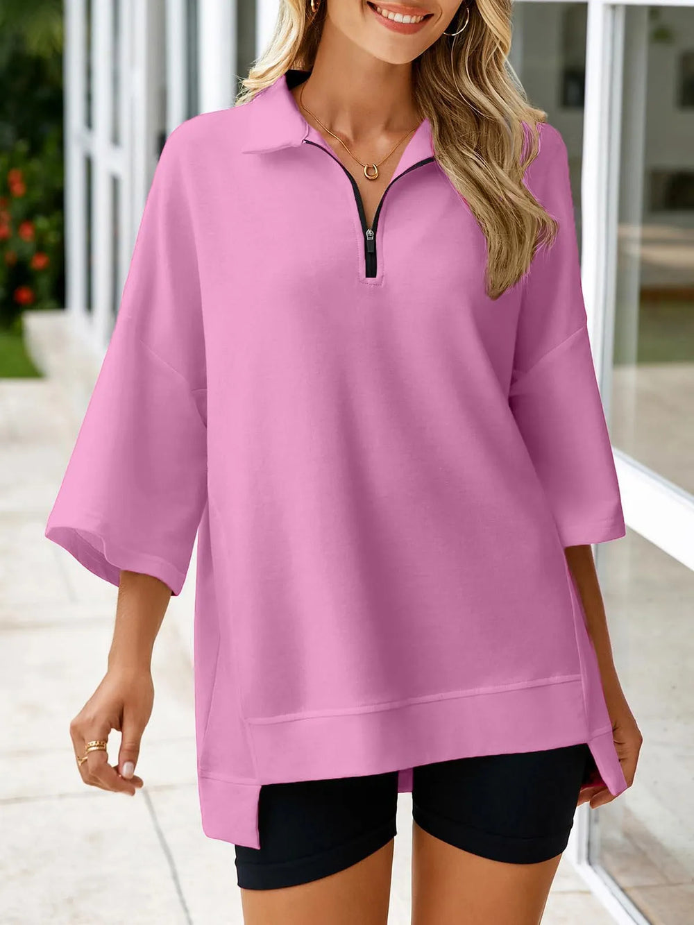 Elevate your style with this oversized pullover, featuring 3/4 sleeves, a zippered V-neck, and a flattering high low hem. Enjoy comfort and versatility.